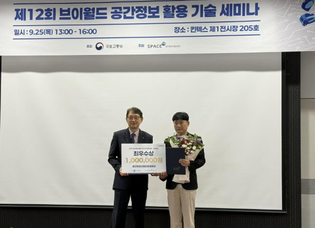 대회 시상식은 25일 일산 킨텍스에 열린 ‘2025 공간정보기술박람회(K-Geo Festa)’에서 진행됐으며, 심사는 공간정보를 활용한 기관 업무 개선 우수사례 등에 대해 전달성, 효과성, 지속성 등 6개 항목 평가로 진행됐다.