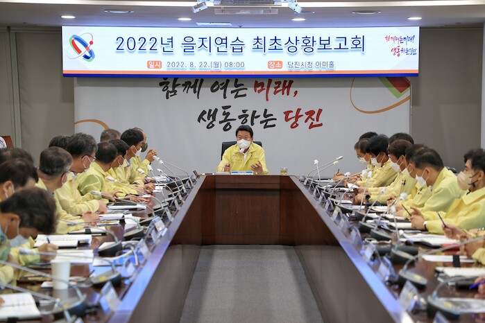 [세계로컬타임즈 홍윤표 조사위원] 당진시는 22일 지휘부 회의실(아미홀)에서 간부 공무원 등 40여 명이 참석한 가운데 2022년 을지연습 최초상황 보고회를 개최했다.
