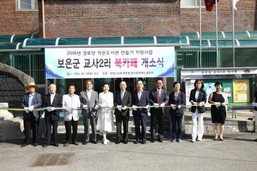 29일 보은군에 따르면 28일 오후 4시 보은읍 교사2리 경로당에서는 정상혁 보은군수, 이심 대한노인회 회장을 비롯해 협력기관 대표 및 노인회 회원 등 60여 명이 참석한 가운데 북카페 개소식이 열렸다.