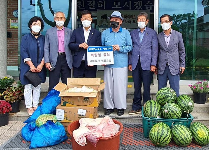 15일 강진군에 따르면 남미륵사는 지난 9일 군동면과 병영면의 취약계층과 경로당 어르신들을 위해 삼계닭과 돼지고기,과일 등 복달임 음식을 제공했다.