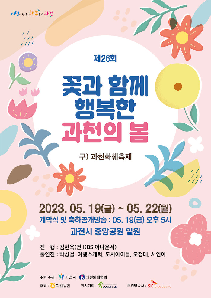 축제는 ‘꽃과 함께 행복한 과천의 봄’을 주제로 꽃 전시관, 직거래 장터, 포토존 설치 등 다양하게 진행된다.