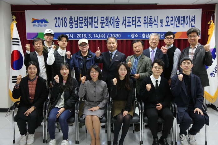 | ▲ 재단법인 충남문화재단이 14일 2018 충남문화재단 문화예술 서포터즈 위촉식과 오리엔테이션을 진행한 후 기념촬영을 하고 있다. |