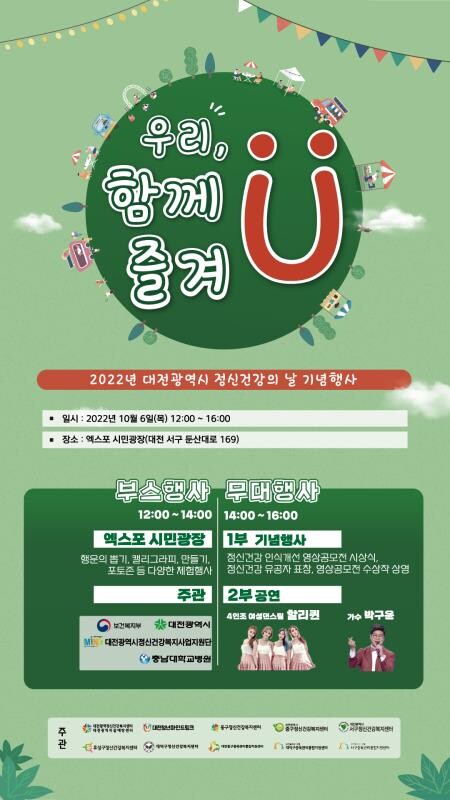 올해 행사는 코로나19로 인해 제한된 신체⋅정신적 건강을 회복하고 힘들었던 마음을 위로하기 위한 목적으로 ‘우리 함께 즐겨U(유)’라는 슬로건으로 정신질환자와 시민이 하나 되어 함께 즐길 수 있도록 마련됐다.