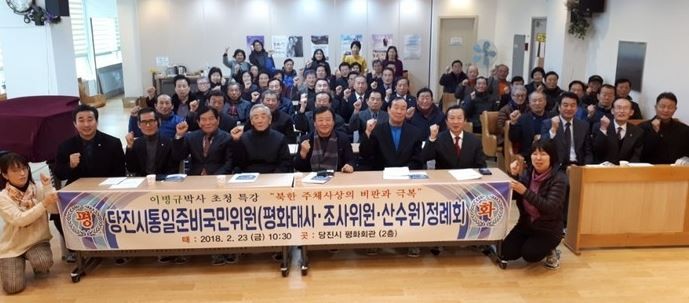 | ▲ 지난 23일 세계평화대사당진시협의회가 2017년 정기총회와 2018년 통일지도자 화합행사 및 정례회의를 가지고 기념촬영을 하고 있다. |