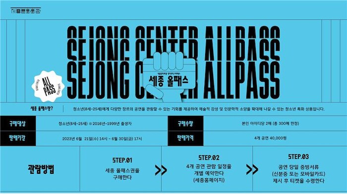 [세계로컬타임즈 이효진 기자] 세종문화회관은 8세부터 25세(2016년생~1999년생)까지 청소년에게 저렴한 공연관람의 기회를 주기 위해 특별한 티켓 패키지 ‘2023 세종 올패스’를 시행한다.