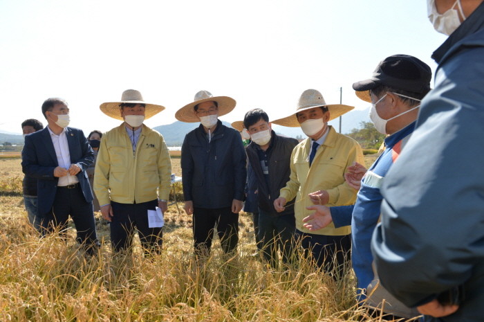 ▲박윤국 시장은 지난 17일 일동면 사직리, 화현면 화현리의 벼베기 수확현장을 찾아 농민들을 격려하고 애로사항 등을 들었다. (사진=포천시 제공) |