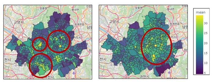 1인가구의 평균적 배달앱의 사용지수가 높게 나온 지역은 주로 대학가 주변으로 측정됐으며, 4인가구로 구성된 집단의 평균적 배달앱 사용지수가 높게 나온 곳은 한강 인근에 거주하는 강남, 서초, 광진구의 행정동으로 분석됐다.