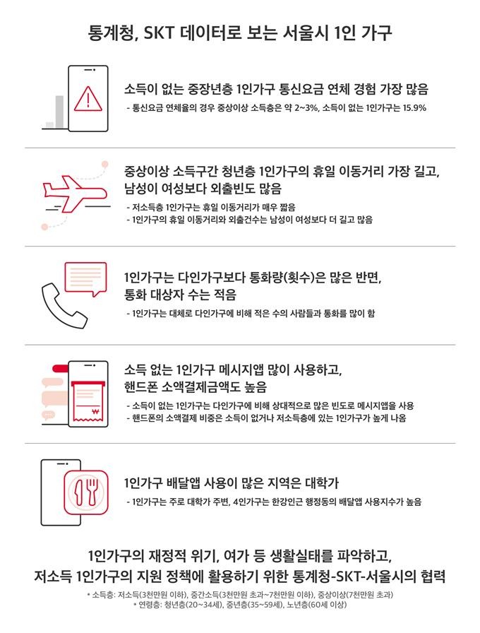 통계청은 인구·가구 통계조사를 통해 파악한 1인가구 데이터를, SKT는 가입자의 통화 패턴, 휴대폰 요금 연체 여부, 소액결제 정보, SNS 이용 등을 가명처리한 결합정보를 활용해 서울시립대학교와 함께 1인가구의 주거 및 생활패턴을 분석했다.