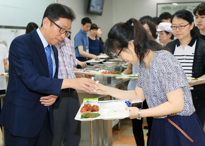 | ▲ 임진찬 대전 서구 부구청장이 5일 취임식을 생략하고 구청 구내식당에서 급식 봉사를 하고 있다. <사진제공=대전 서구청> |