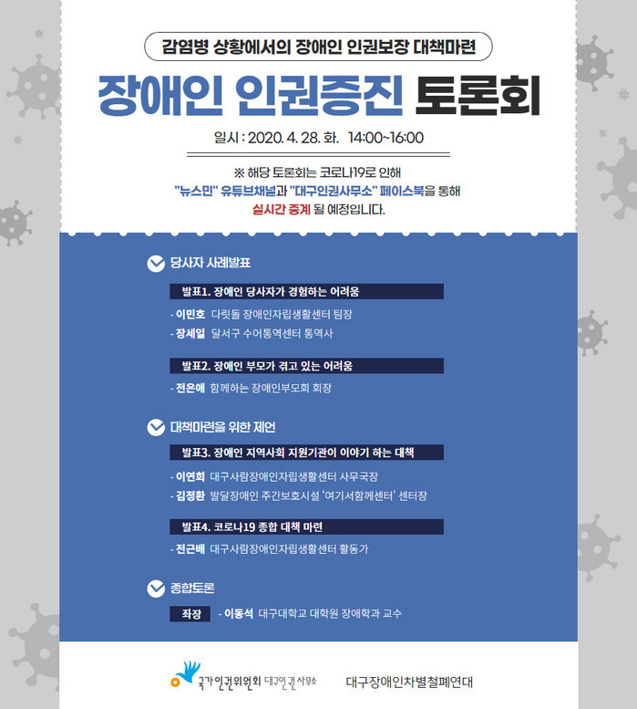 대구인권사무소 인권교육센터에서 오는 28일 열리는 이번 토론회는 장애당사자와 가족들이 직접 사례 발표를 통해 대구 지역의 코로나19 감염병 초기부터 현재까지 발생한 차별적이고 인권침해적인 일들과 앞으로 발생할 곤란함에 대해 알린다.
