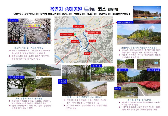 옥처럼 아름다운 구슬을 꿴 듯한 옥연지(玉淵池) 송해공원 코스는 봄이면 벚꽃이 장관을 이룬다. 특히 국도에서 옥포로로 접어들면 수령이 오래된 벚나무 터널이 장관이다. 이 길을 따라 계속 직진하면 옥연지 송해공원이 나온다. 저수지 둘레길 걷기 · 풍차 · 폭포 등이 볼만하며 반송삼거리를 지나 천년고찰 용연사를 들르면 좋다. 그 후 화원명곡으로 넘어가는 명곡로로 가면 봄철 도로변에 피어있는 영산홍과 늦여름까지 배롱나무 꽃도 볼 수 있다. 기남지에서 잠시 쉬었다가 명곡로를 따라 계속 가다보면 명고초등학교를 지나 화원119안전센터에 다다르게 된다.
