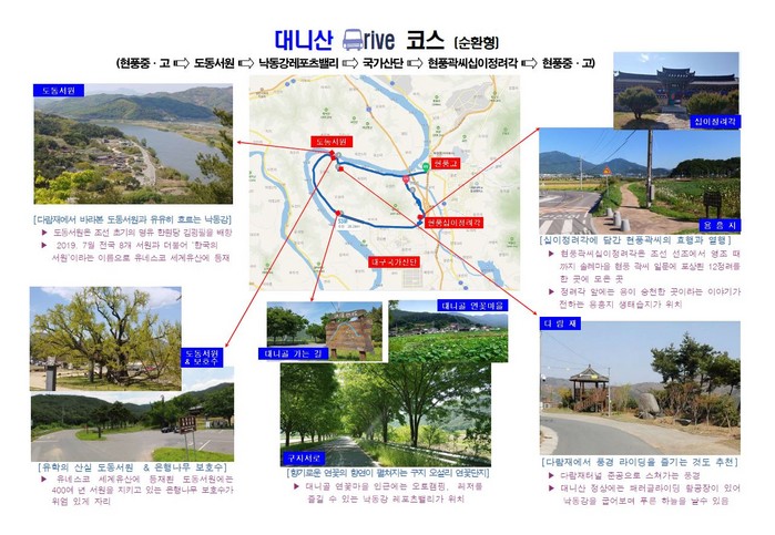 대니산 자락을 한 바퀴 돌 수 있는 대니(戴尼)산 코스는 산등성이가 마치 다람쥐를 닮았다 해서 이름 붙여진 다람재에서 바라보는 도동서원과 낙동강이 굽이쳐 대니산을 휘감아 남해로 흘러가는 모습은 한 폭의 그림과 같다. 대구지도에서 물밖에 드러난 상어 지느러미 모양을 한 곳이 바로 도동서원이 있는 곳이다.