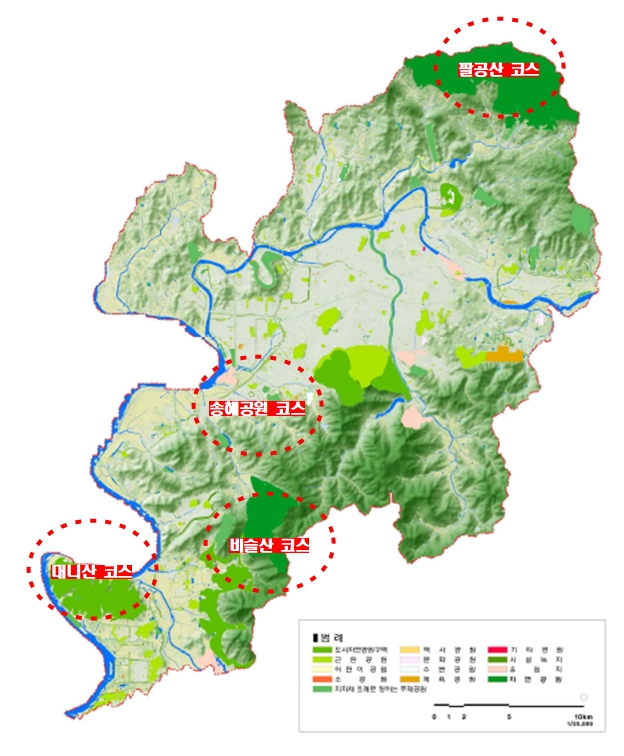 1코스는 파군재삼거리~백안삼거리~동화사입구~수태골~파계삼거리~파군재삼거리로 총 구간거리가 30㎞이다.