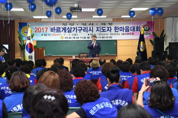 | ▲지난 7일 백경현 구리시장(중앙)이 구리시바르게살기운동 지도자 수련대회에서 축사를 하고 있다.<사진제공=구리시청> |