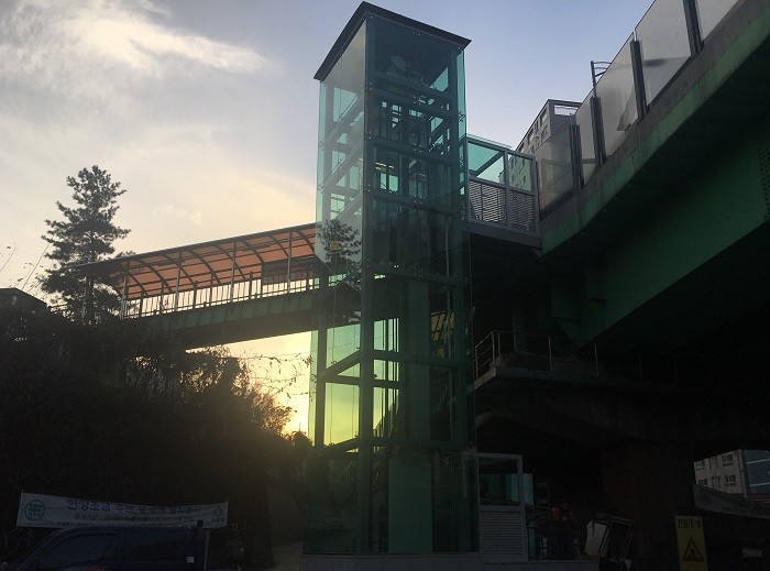 | ▲ 비산고가차도 보행로와 지상을 연결하는 17인승 대형승강기.(사진=안양시 제공) |