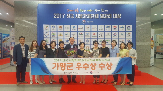 가평군은 24일 중소기업중앙회에서 고용노동부 주관으로 열린 ‘2017 전국 지방자치단체 일자리대상’ 시상식에서 지역일자리목표 공시제 실적 우수지자체로 선정됐다고 밝혔다.