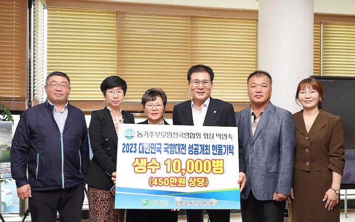 [세계로컬타임즈 이남규 기자] 전남 함평군은 '2023 대한민국 국향대전'의 성공적인 개최를 기원하면서 농가주부모임전국연합회에서 생수 1만병(450만원 상당)을 기증해 왔다고 밝혔다.