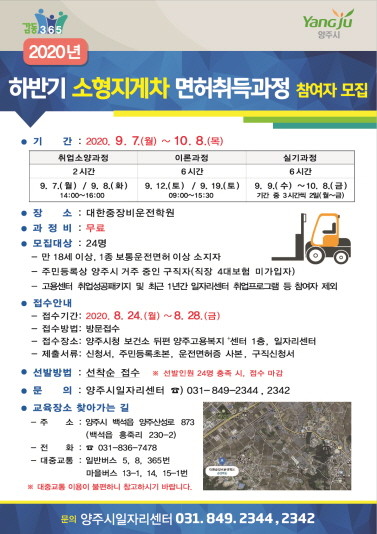 [세계로컬타임즈 허태일 기자]양주시 일자리센터는 오는 24일부터 2020년 하반기 ‘소형지게차 면허취득과정’에 참여할 교육생을 모집한다.