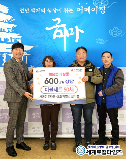 나영근 금마면장은 “어려운 이웃을 위해 이불을 기탁해 주신 서동한우타운, 오늘제빵소 대표님께 감사드린다”며 “며칠 전부터 날씨가 부쩍 추워져 좀 더 따뜻한 잠자리를 마련해 드릴 수 있어 마음 한켠이 훈훈해 진다”고 말했다.