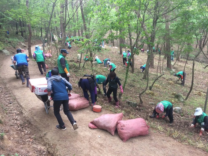| ▲ 새마을운동협의회원들이 물무산 숲속에 맥문동을 심는 모습. <사진제공=영광군청> |