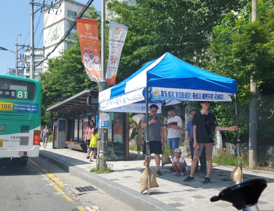 3일 화성시에 따르면 시는 시민들의 왕래가 잦고 나무그늘이 없는 버스정류장 옆, 횡단보도, 교통섬 등을 중심으로 천막 형태의 그늘막 쉼터 40개소를 지난달 말 설치했다.