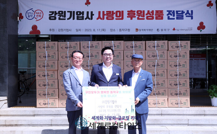 | ▲ 지난 17일 서울시 동작구청에서 이배연(사진 맨 오른쪽) 세계일보 중앙위원회 조사위원이 2,500만 원 상당 장수복 증정식 후 박일하(사진 가운데) 동작구청장과 기념촬영을 하고 있다. |