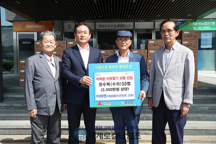 | ▲ 지난 18일 강원도 홍천군청에서 2,500만 원 상당 장수복 증정식 후 이배연(사진 오른쪽에서 두 번째) 강원기업사 대표이사가 신영재(사진 왼쪽에서 두 번째) 홍천군수와 기념촬영을 하고 있다. |