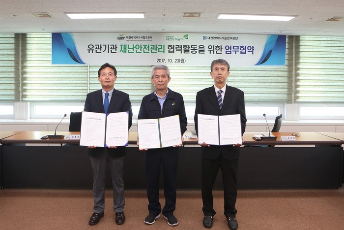 대전시설관리공단, 대전도시철도공사, 대전도시공사는 23일 대전도시철도공사 중회의실에서 ‘재난안전관리 협력체계 구축 업무협약’을 체결했다.