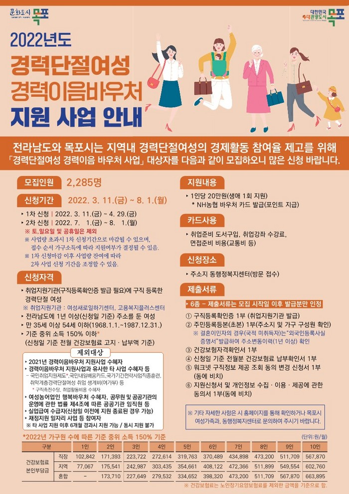 모집인원은 2,285명으로 신청 자격은 신청일 기준으로 전라남도에 1년 이상 주소를 둔 만 35세부터 54세(1968.1.1.~1987.12.31.) 경력단절여성으로 취업지원기관(여성새로일하기센터, 고용복지플러스센터 등)에 구직을 등록하고 신청일 기준 전월 건강보험료가 기준 중위소득 150% 이하면 누구나 신청 가능하다.