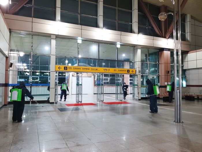| ▲ 인천 미추홀구 지하철역에서 담당자들이 집중방역활동을 벌이고 있다. (사진=인천 미추홀구청 제공) |