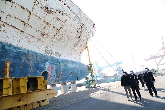 | ▲김종욱 서해지방해양경찰청장이 22일 전남 목포 신항을 찾아 세월호 선체를 살펴보고 있다.(사진=서해지방해양경찰청) |