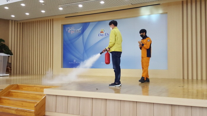 지난 17일 진행된 이번 훈련은 코로나바이러스 확산세와 사회적 거리두기가 2.5단계 상황임을 감안해, 소방안전교육으로 대체해 실시했다. 화재 초기 대응방법 및 소화기 사용요령 등 실생활에서 유용하게 활용할 수 있는 내용으로 교육을 진행했다.