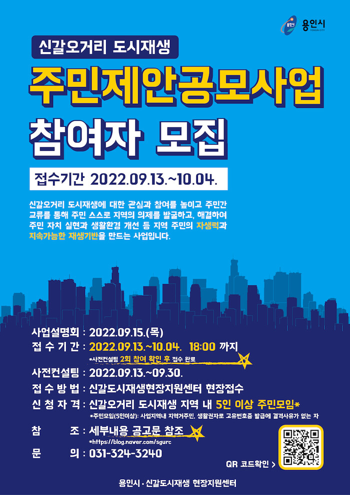 [세계로컬타임즈 이지안 기자] 용인특례시가 다음달 4일까지 신갈오거리 도시재생 주민제안 공모사업에 참여할 주민을 모집한다고 15일 밝혔다.
