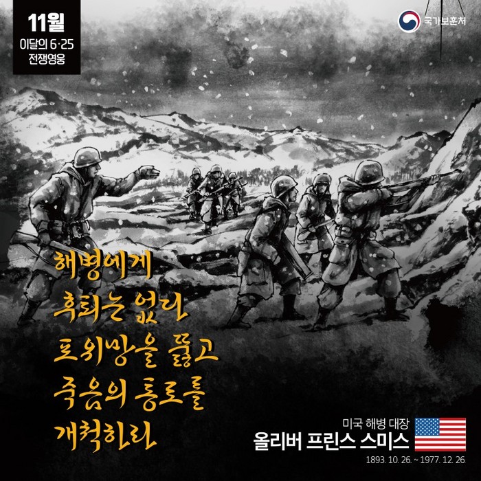 '11월의 6·25 전쟁영웅'에는 장진호 철수작전을 지휘한 올리버 프린스 스미스(Oliver Prince Smith, 1893.10.26~1977.12.26) 미 해병 대장이 선정됐다.