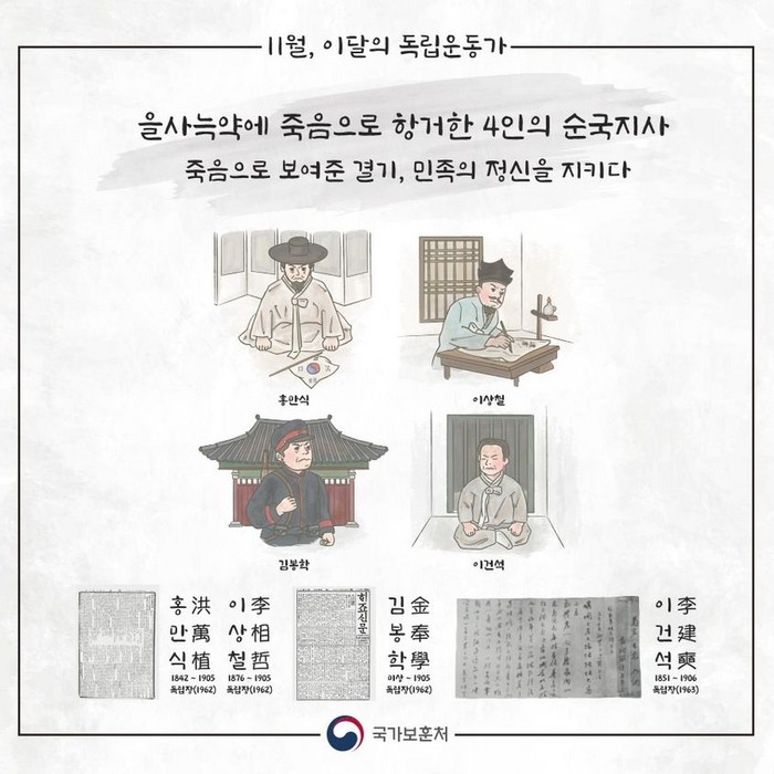 2021년 '11월의 독립운동가'에는 죽음으로 민족정신을 지킨 홍만식‧이상철‧김봉학‧이건석 선생이 선정됐다. 네 분의 선생은 일제가 군대를 동원하고 고종을 협박해 강압적으로 1905년 11월 17일에 을사늑약을 체결하자, 이에 통분해 스스로 목숨을 끊어 을사늑약의 부당함을 알렸다.