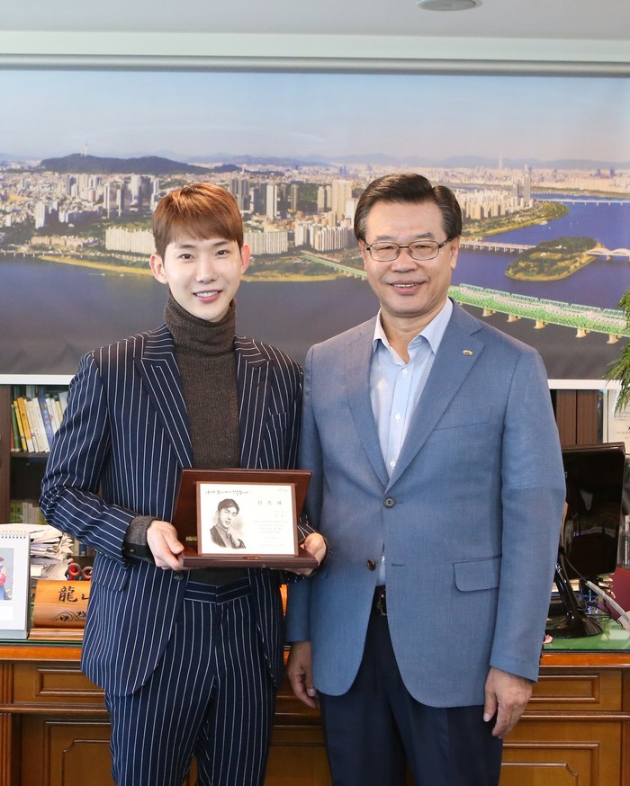 | ▲ 서울 용산구의 새 홍보대사로 위촉된 2AM 멤버 조권(왼쪽)과 성장현 용산구청장이 기념촬영을 하고 있다. <사진제공=용산구청> |