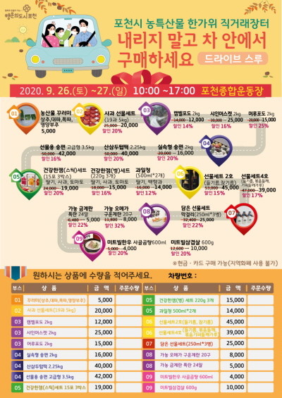 오는 26일~27일 포천종합운동장에서 열리는 행사는 오전 10시~오후 5시 차량을 타고 행사장 안내소에서 구매 주문서를 받아 구매하고 싶은 직거래 부스에서 차량에서 내리지 않고 현금 또는 카드로 이용할 수 있다.