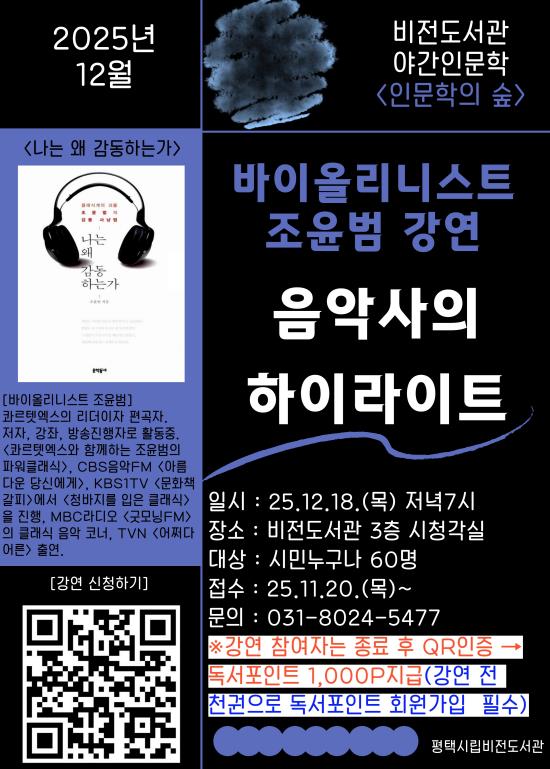 ‘음악사의 하이라이트’는 방대한 서양 음악사의 흐름을 2시간으로 압축하여 마치 영화를 보듯 자연스럽게 이해할 수 있는 강연이다. 각 시대의 대표적인 사건과 음악적 변화를 통해 클래식을 깊이 있고 풍부하게 만날 소중한 기회가 될 것으로 기대된다.