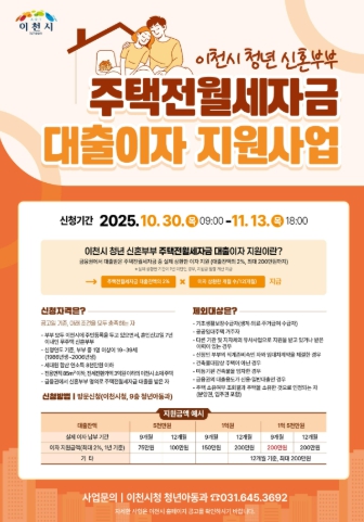 지원대상은 ▲부부 모두가 이천시에 주민등록을 두고 ▲연령[부부 중 1명 이상이 19세~39세(1986년생~2006년생)] ▲소득(세대원 합산 연 소득 8천만 원 이하) ▲주택(전용면적 85㎡ 이하, 전세전환가액 3억 원 이하의 이천시 소재 주택) ▲대출조건(금융권에서 신혼부부 명의 주택전월세자금 대출) 등을 모두 만족하는 무주택 신혼부부이다.