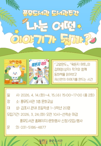 참여 신청은 3월 24일 오전 10시부터 풍무도서관 홈페이지에서 할 수 있으며, 김포시 관내 초등학생 1~3학년 20명을 선착순으로 모집한다