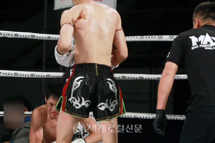 | ▲ 윤덕재 선수의 니킥을 맞은 강윤성 선수가 그대로 주저 앉았다. |