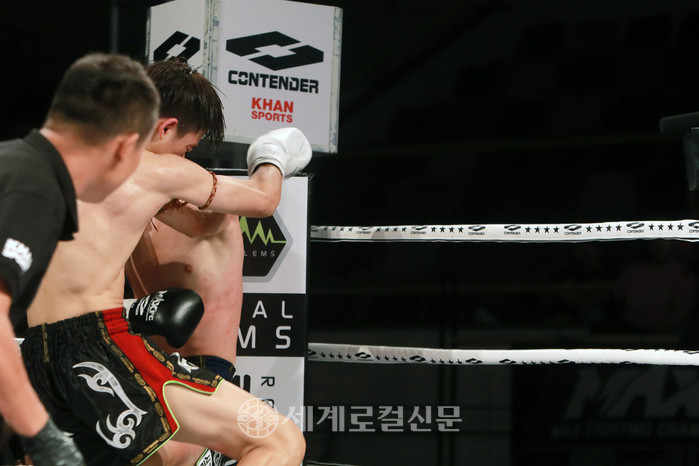 [세계로컬신문 조주연 기자] MAX FC 밴텀급 챔피언 윤덕재(의왕삼산 무페타이) 선수가 강윤성 선수를 상대로 치른 자신의 2차 방어전에서 마지막 공격을 시도하고 있다.