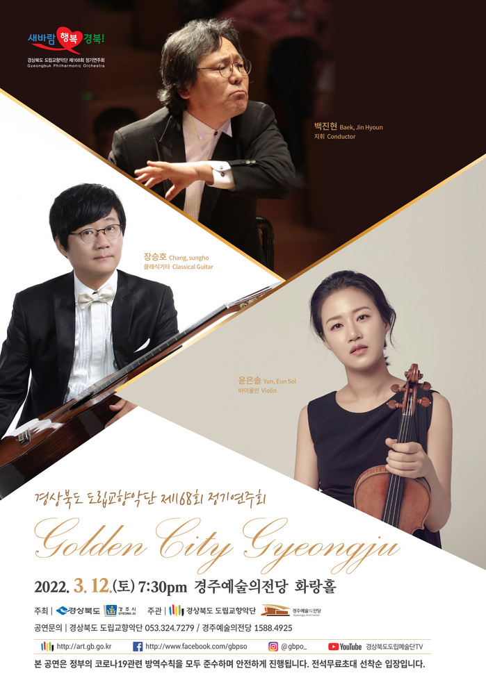 김상철 경북도 문화관광체육국장은 “코로나19로 심신이 지친 도민을 위로하고, 희망과 용기를 주는 메시지를 담아 콘서트를 준비했다”며, “도립교향악단의 멋진 연주로 그 간의 피곤함을 잠시 내려놓고 충전할 수 있는 시간이 됐으면 한다”고 말했다.