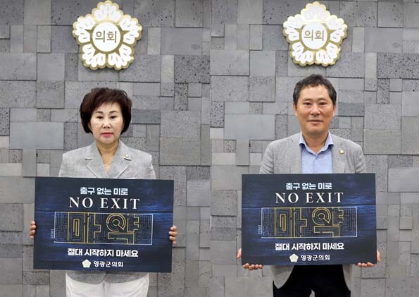 [세계로컬타임즈 이남규 기자] 7일 전남 영광군의회 자치행정위원장 정선우 의원과 산업건설위원장 조일영 의원이 마약 범죄 근절을 위해 ‘NO EXIT’캠페인에 동참했다.