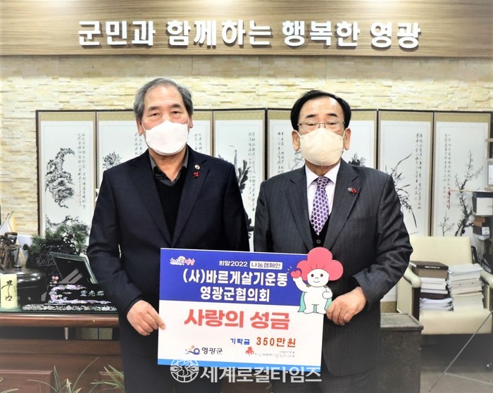 [세계로컬타임즈 이남규 기자] 바르게살기운동 영광군 협의회는 지난 28일 이웃돕기 성금 350만 원을 영광군에 기탁했다.
