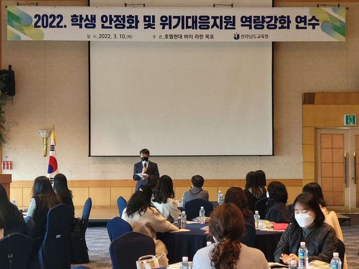 [세계로컬타임즈 김명진 기자] 전라남도교육청이 10일 호텔현대 바이 라한 목포에서 도내 Wee센터 위기학생 지원 업무담당자와 임상심리사 등 50명이 참석한 가운데 학교 안정화 지원을 위한 ‘위기대응지원 역량강화 연수’를 진행했다.
