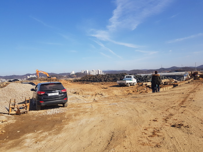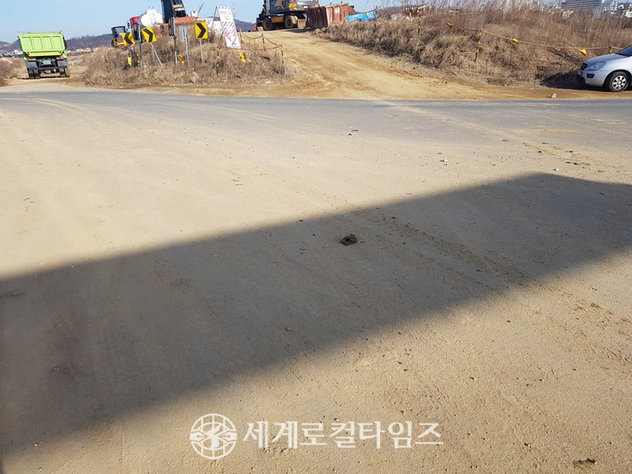 | ▲ 세륜기와 물차 없이 불법으로 농지를 야적장처럼 사용하고 있는 관급공사 현장.(사진=시흥시 출입기자단 공동) |