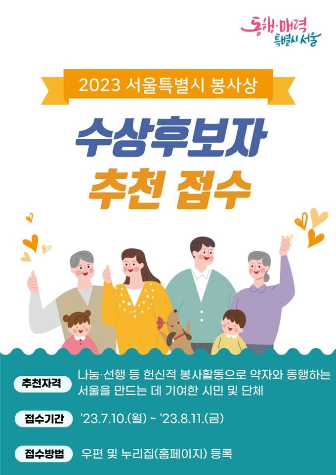 [세계로컬타임즈 이효진 기자] 서울시는 이웃에 대한 지속적인 관심과 봉사 정신으로 약자와 동행하는 서울을 만드는데 기여한 시민 및 단체를 ‘2023년 서울특별시 봉사상’ 수상 후보자로 추천받는다.