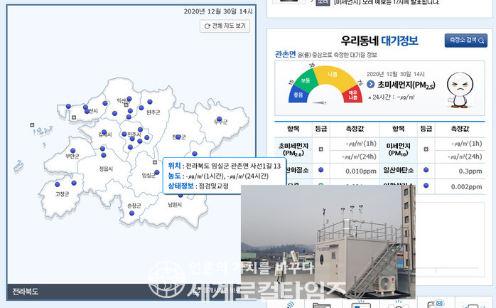 | ▲관촌면사무소 옥상에서 설치된 대기오염측정소. (에어코리아 갈무리,사진=임실군 제공) |
