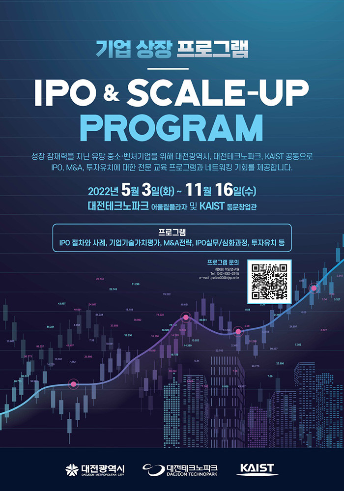 [세계로컬타임즈 민순혜 기자] 대전시는 카이스트(KAIST), 대전테크노파크(대전 TP)와 함께 성장 잠재력을 지닌 지역 유망 중소‧벤처기업을 발굴해 투자유치 및 코스닥 상장을 체계적으로 지원하는 ‘기업 상장(IPO) 프로그램’을 운영한다고 밝혔다.